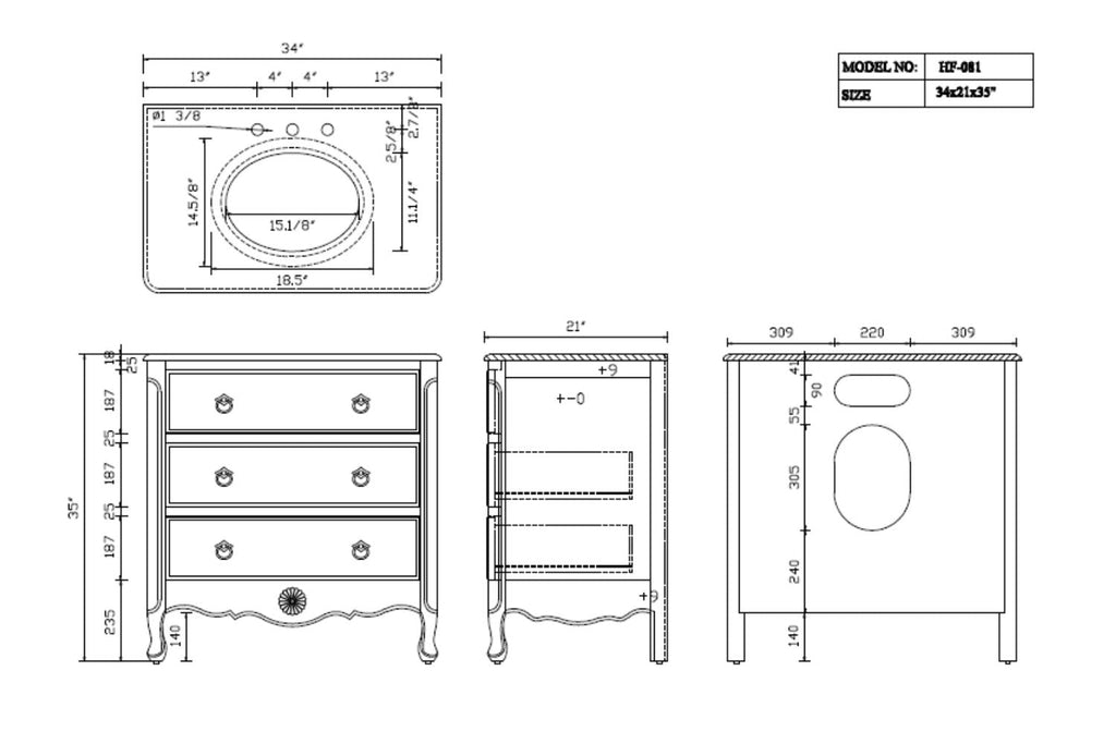 Product Dimension: 34"W x 21"D x 35"H (Inc. Counter top)